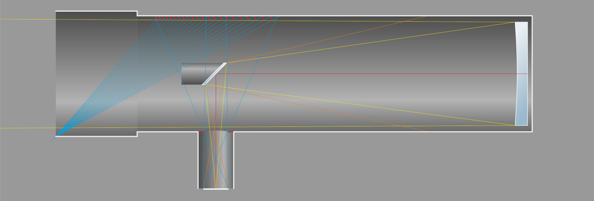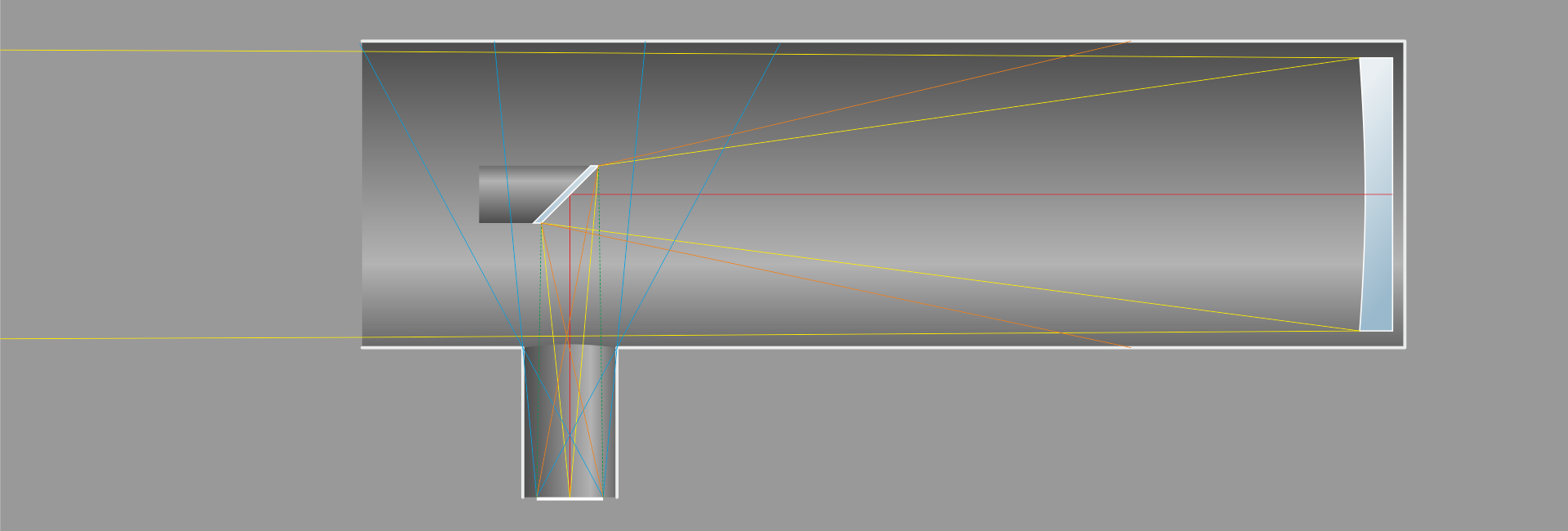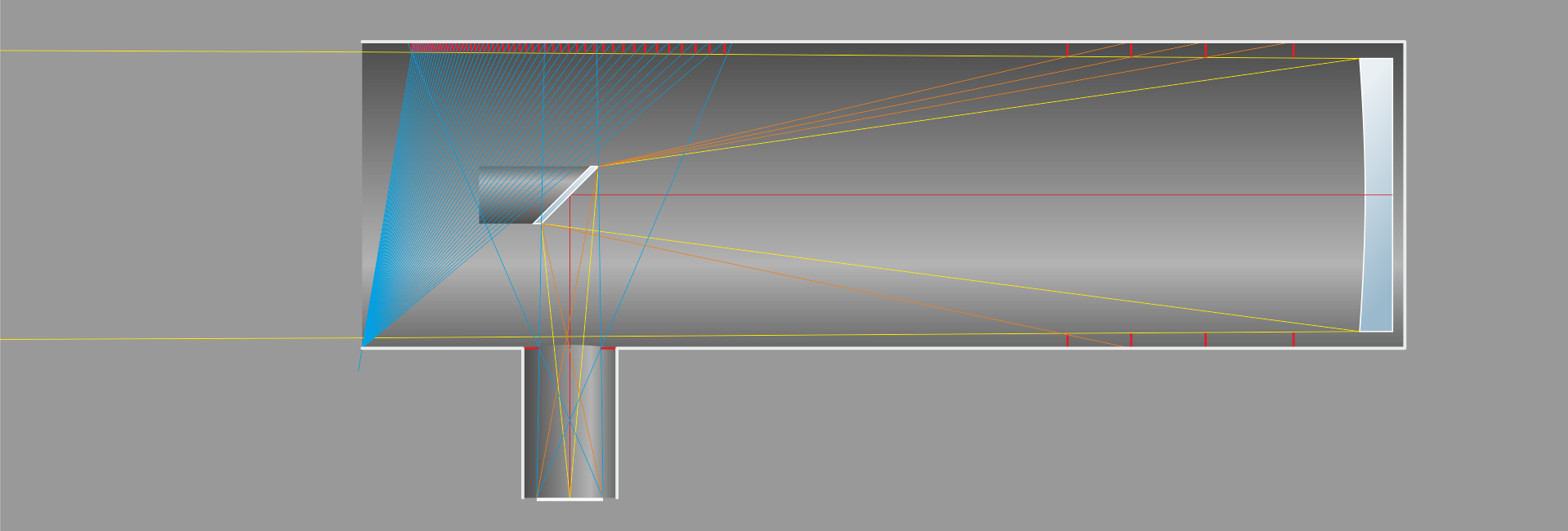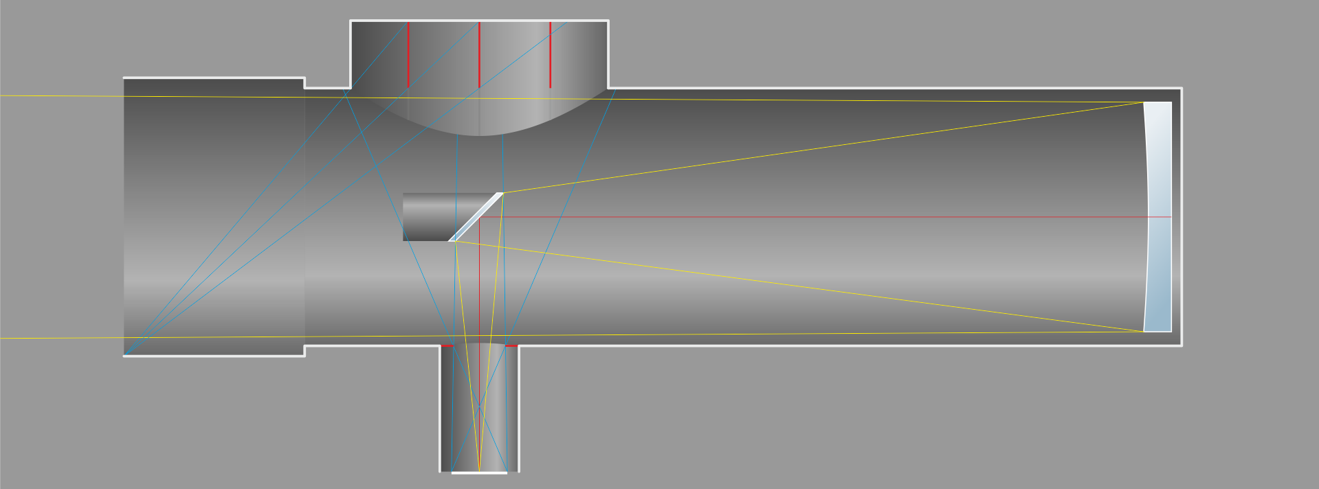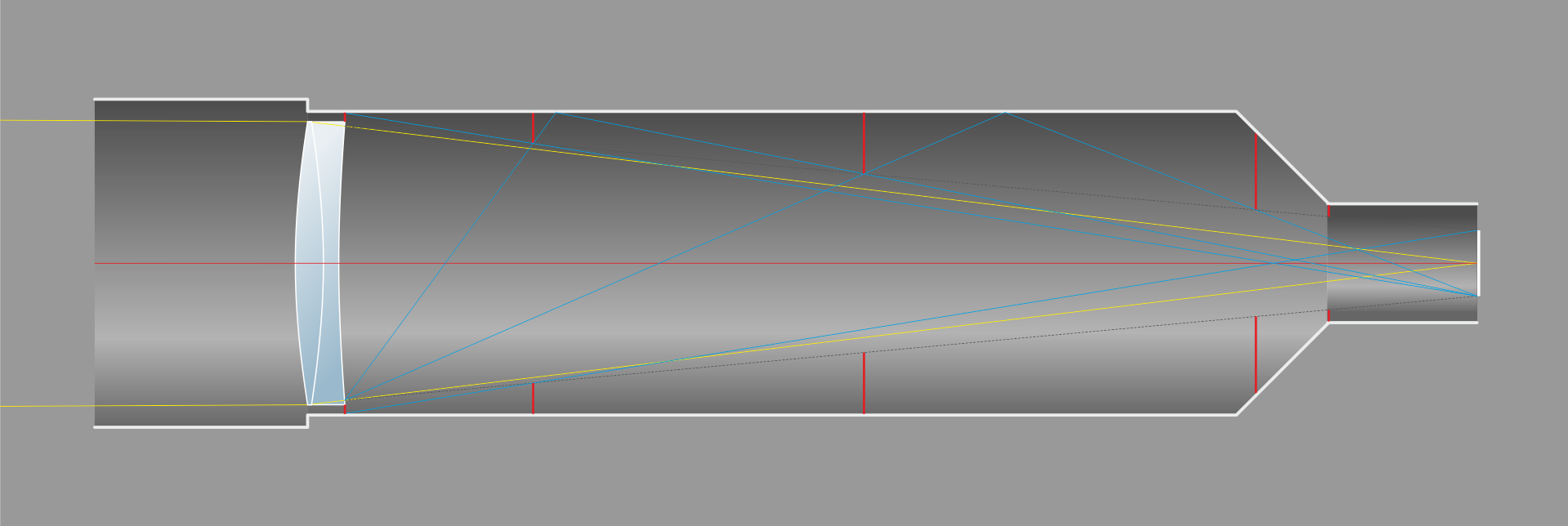 Eine andere Möglichkeit besteht darin, anstelle der Blendenphalanx eine Lichtfalle einzubauen. Die Idee ist, dass einfallendes Störlicht in ein Loch fällt und man letzten Endes in ein dunkles Rohr hineinblickt. Um das allein über ein Rohr zu ereichen, müsste die Lichtfalle ganz schön lang sein. Besonders bei lichtstarken Newtons ohne Taukappe, wo der sichtbare Bereich der Tubuswand durchaus so dick wie der Haupttubus sein kann, müsste die Lichtfalle so dick wie der Tubus und unter Umständen sogar länger als dieser sein. Eine Lichtfalle ist eine klasse Idee, doch muss sie meines Erachtens mit Blenden versehen sein, soll sie a) nicht zum Geschwür ausarten und b) effektiv sein.