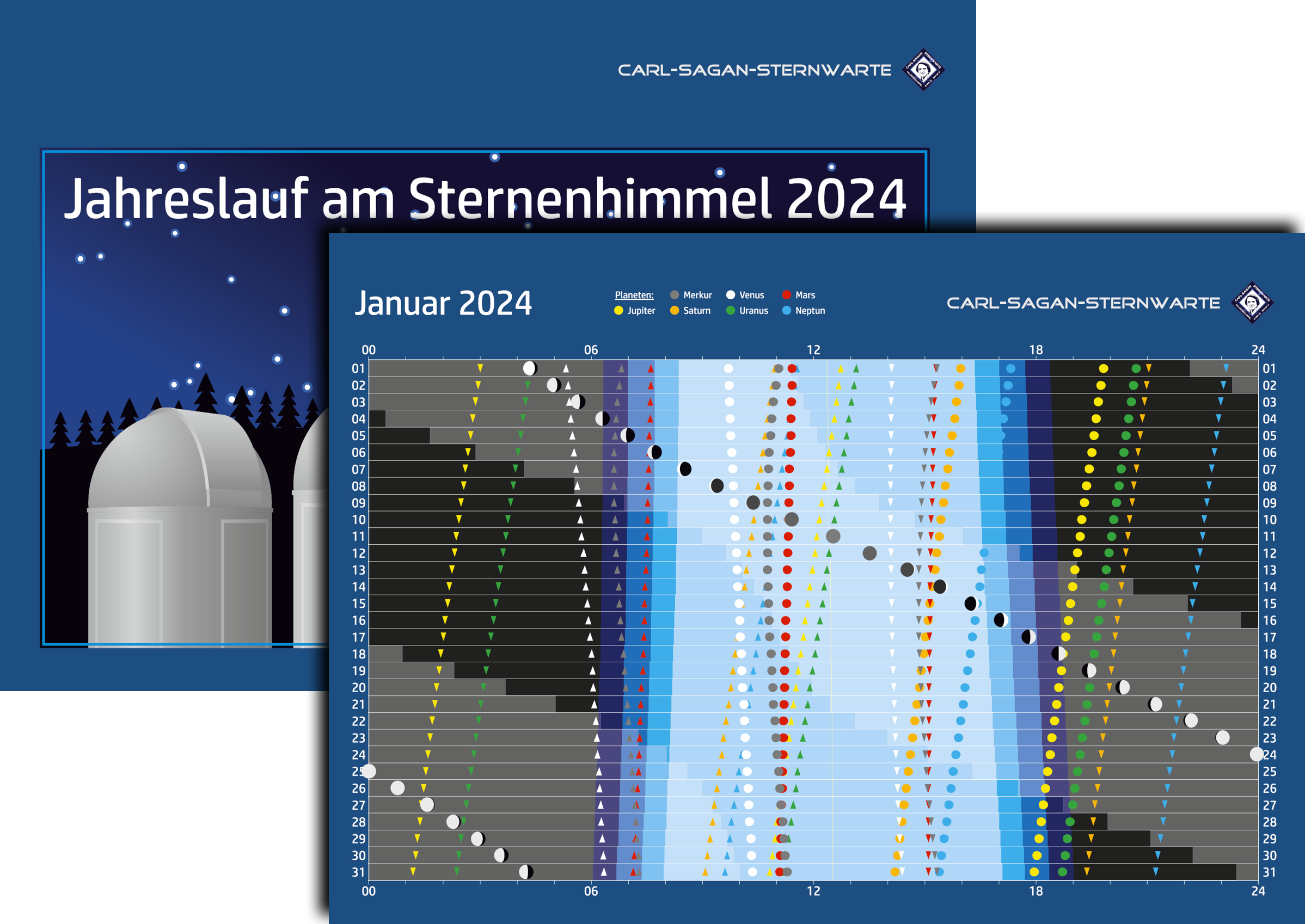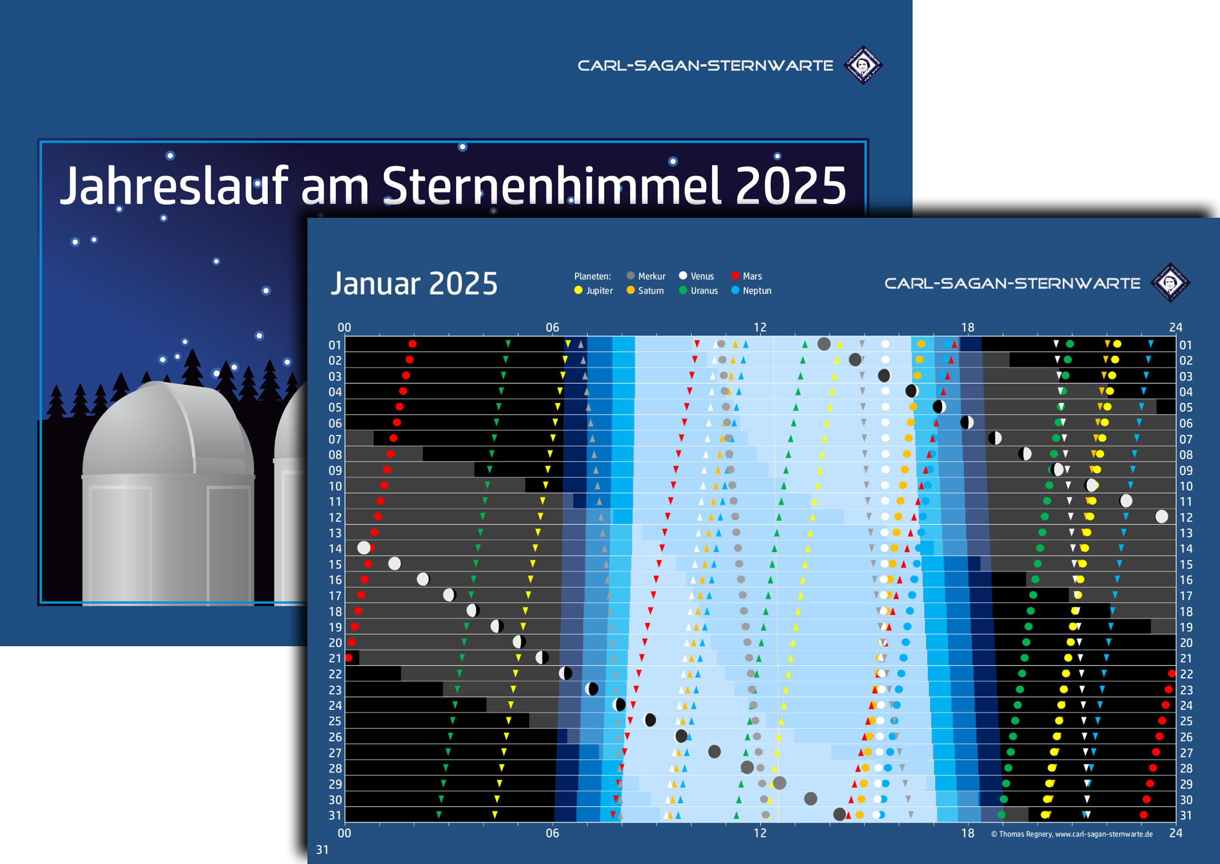 Statt Apps durchzudaddeln und Himmelskalender zu wälzen, warum nicht den jeweilgen Monat aufgeschlagen neben der Küchentür hängen haben und auf einen Blick wissen was läuft? Wann ist an DeepSky nicht zu denken, weil der Mond über dem Horizont steht? Wann kulminieren die Planeten? Wann gehen sie auf und unter? Wann ist es dunkel genug, um mit Astrofotos anzufangen?